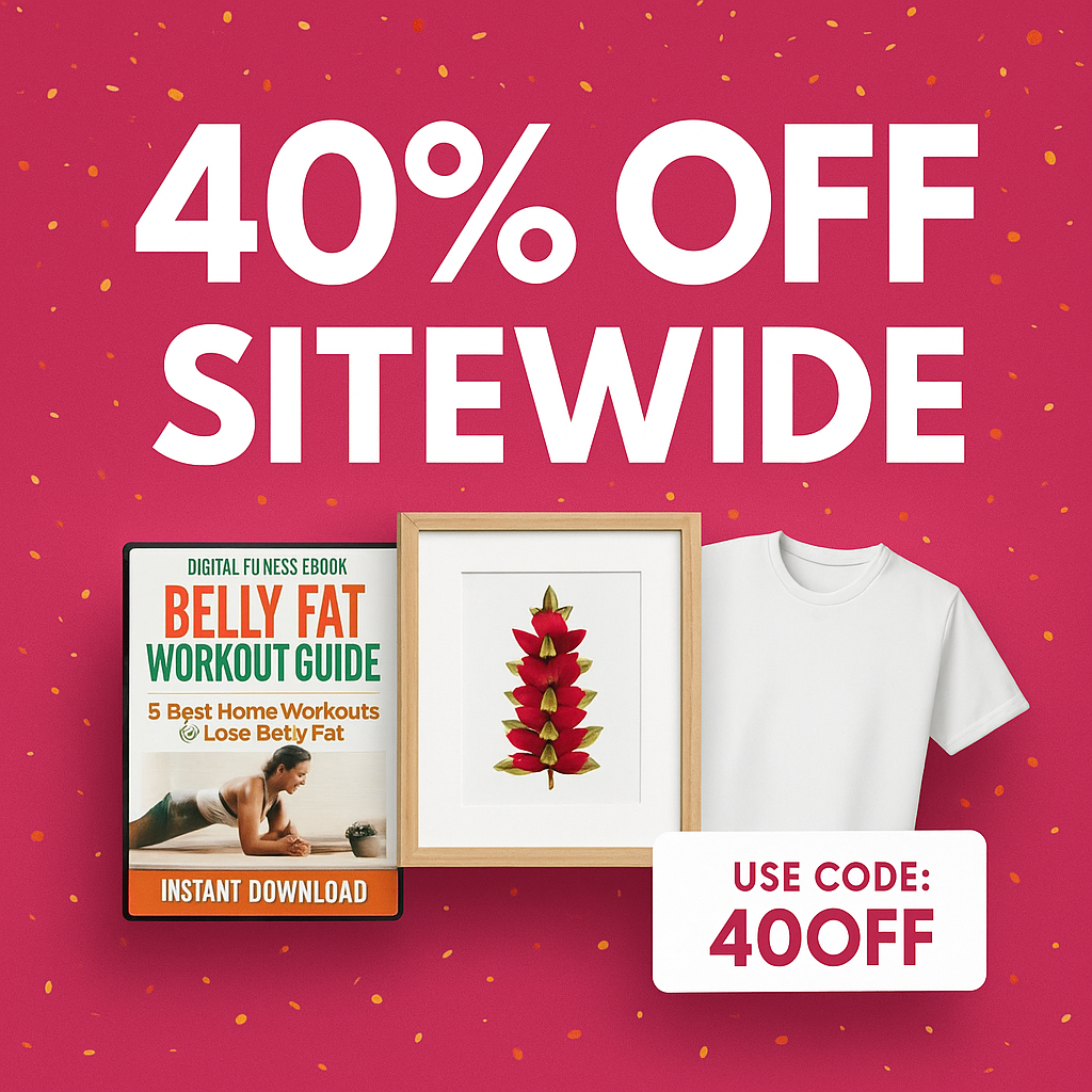 Everything’s on sale — digital bundles, eBooks, fitness guides, wall art, and custom tees. USE CODE 40OFF at Checkout