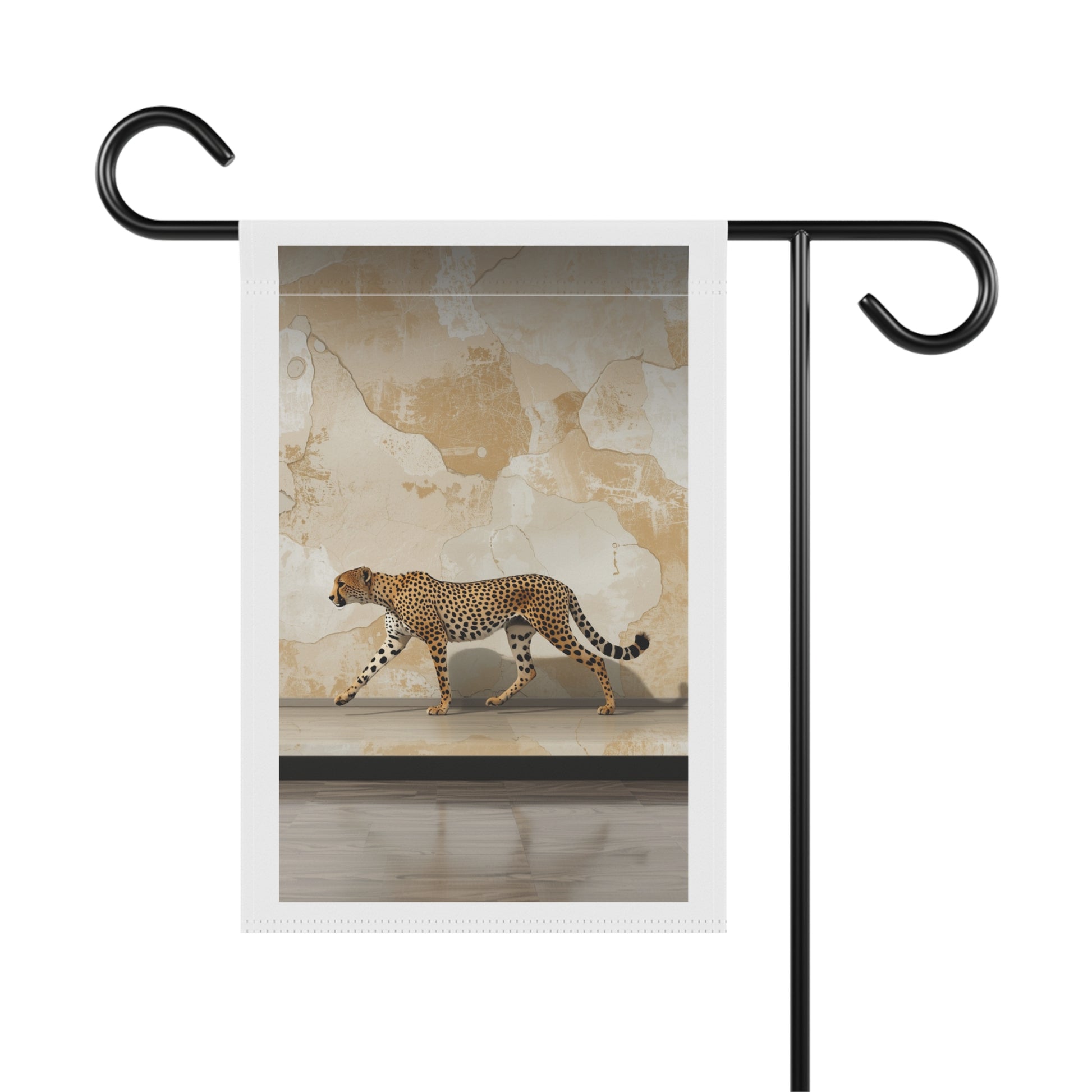 This garden banner brings a quiet, sophisticated wildness to your outdoor spaces. A sleek cheetah prowls across a muted, textured backdrop that feels like sun-warmed plaster and weathered maps. Lightweight yet durable poly poplin-canvas lets the print sit flat and vivid, while the black inner lining gives the design depth from both sides. Hang it from a standard garden pole to introduce a breath of safari elegance to your porch, patio, or entryway—subtle and striking, it grounds modern and eclectic gardens alike.
