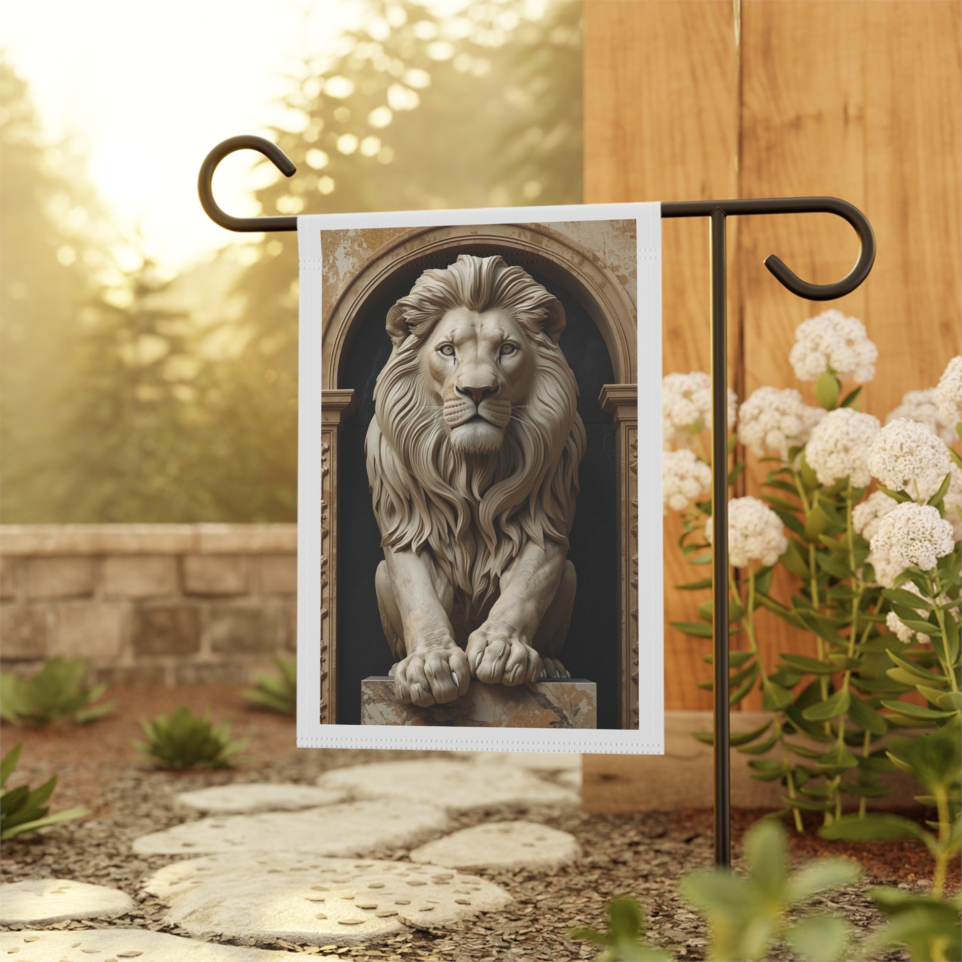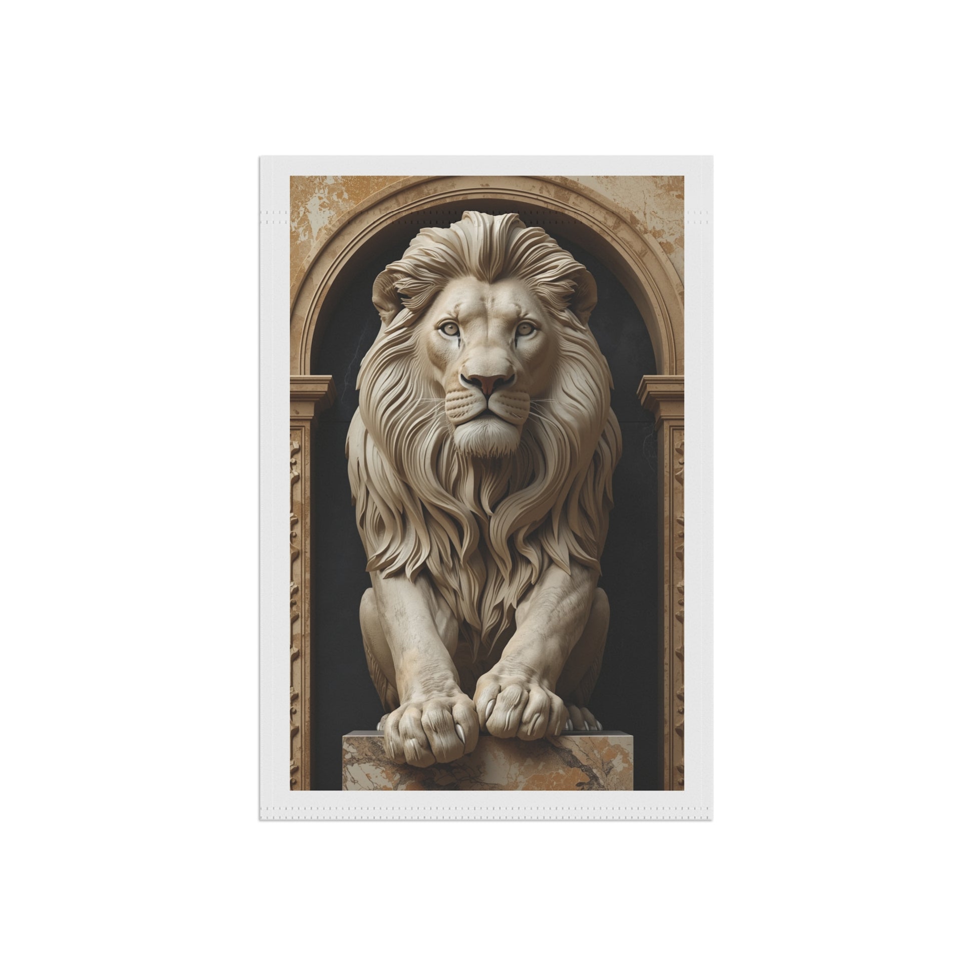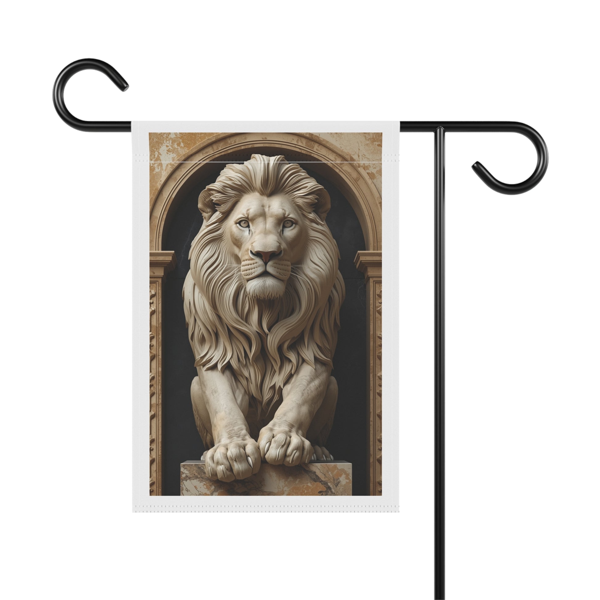 A stately garden banner that brings quiet grandeur to your outdoor or entryway space. The regal lion statue print reads like a guardian at your gate — calm, watchful, and beautifully detailed. Soft poly poplin-canvas holds rich, archival color so the sculpted shadows and warm stone tones stay crisp outside. Hang it from a standard garden pole or display stand to add an artful, classical touch to a porch, path, or courtyard. The double-sided print keeps the image visible from both sides while the black inner lining gives the piece depth and a tailored finish. It feels like a small moment of museum-like presence for anyone who appreciates sculptural elegance and timeless design.